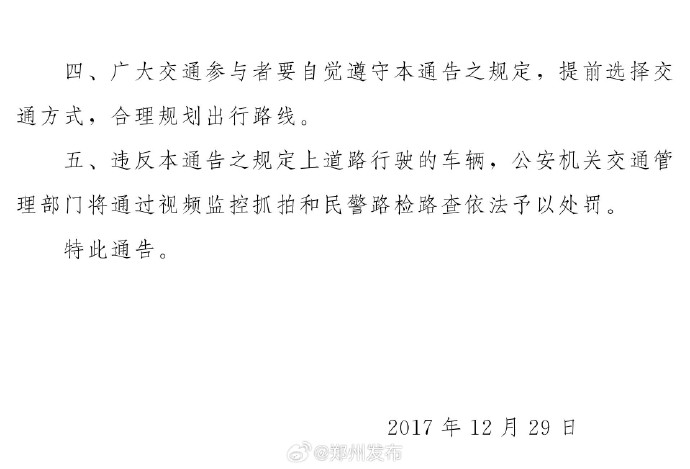 郑州市生态环境保护工作专班办公室11月7日发布通知,进入秋冬季以来,郑州市环境空气质量改善压力持续增大。为减少机动车污染物排放,缓解道路交通压力,提升城市管理效能,保障群众身体健康和城市道路交通有序运转,经研究,决定自2025年11月10日起恢复执行《郑州市人民政府关于实施机动车限行措施的通告》(郑政通〔2017〕42号)有关规定。