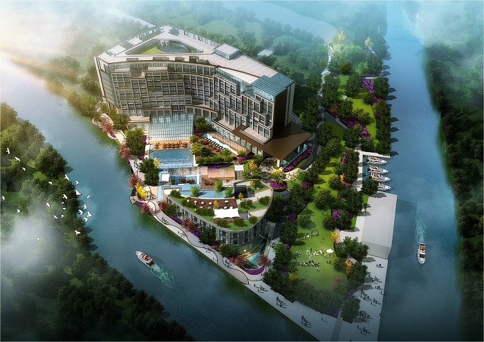 酒店位于虹桥枢纽,苏州河与朱家浜河的交汇处,占地七万余平米,外观时髦前卫,内里则以中国玉雕艺术为灵感来打造,富有韵味。