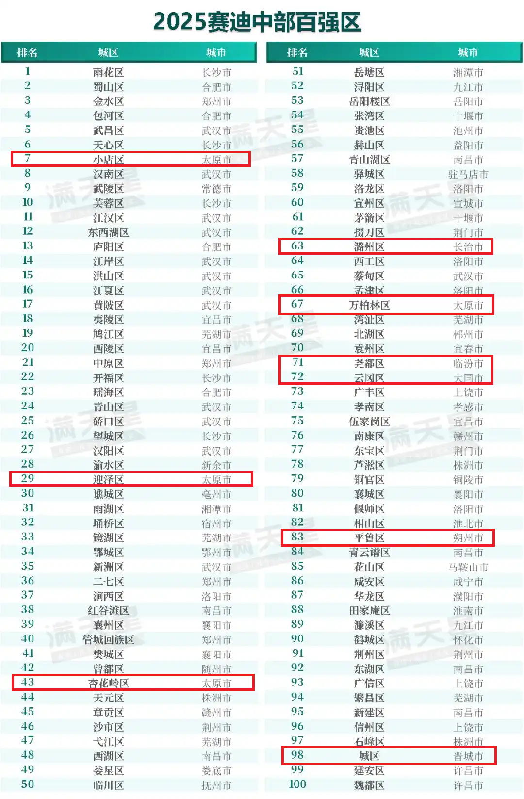 其中,山西省泽州县、沁水县上榜中部百强县榜单,分别位列第61、第96位;太原市小店区、迎泽区、杏花岭区、万柏林区,长治市潞州区,临汾市尧都区,大同市云冈区,朔州市平鲁区,晋城市城区9个区上榜中部百强区榜单。