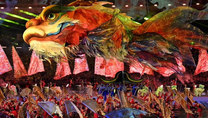 纵观整场开幕式,场地演出与高技术深度融合,例如全息投影还原百人英歌舞的磅礴,增强现实技术则让龙舟竞渡场景 “延伸”,“神鳌”身上的鳞片都装有可变换颜色与角度传感器,其身体材料采用可回收的环保材料。