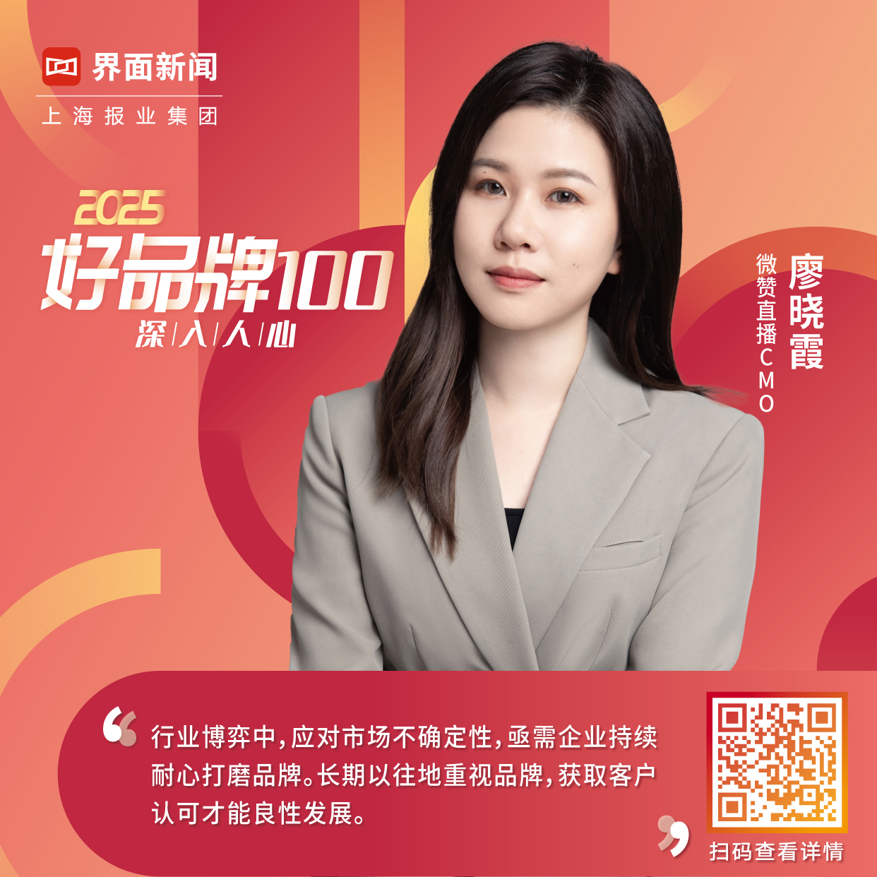 微赞直播CMO廖晓霞受邀正式担任2025【好品牌100】终审评审团评委。她的品牌洞察是:行业博弈中,应对市场不确定性,亟需企业持续耐心打磨品牌。长期以往地重视品牌,获取客户认可才能良性发展。