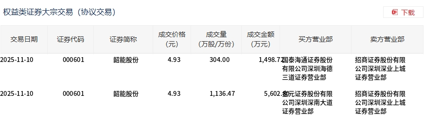 11月10日,韶能股份大宗交易成交1440.47万股,成交额7101.52万元,占当日总成交额的41.52%,成交价4.93元,较市场收盘价5.41元折价8.87%。