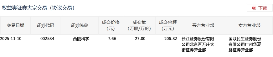 11月10日,西陇科学大宗交易成交27万股,成交额206.82万元,占当日总成交额的1.4%,成交价7.66元,较市场收盘价8.55元折价10.41%。