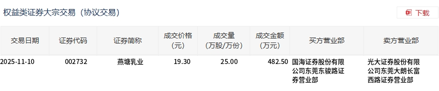 11月10日,燕塘乳业大宗交易成交25万股,成交额482.5万元,占当日总成交额的6.25%,成交价19.3元,较市场收盘价17.93元溢价7.64%。