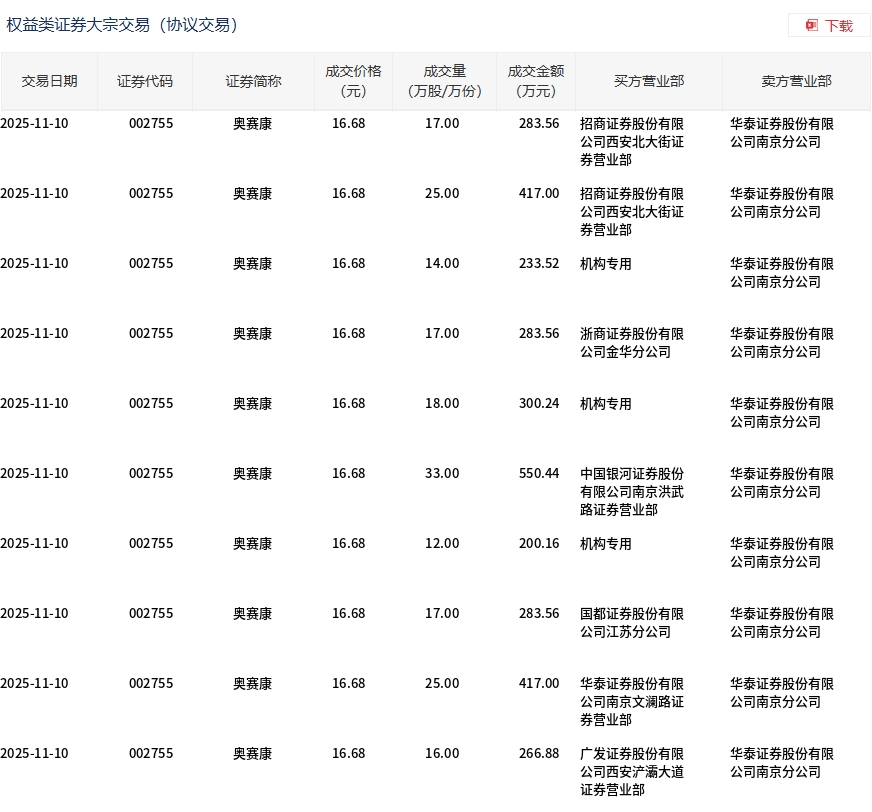 11月10日,奥赛康大宗交易成交194万股,成交额3235.92万元,占当日总成交额的12.61%,成交价16.68元,较市场收盘价18.8元折价11.28%。