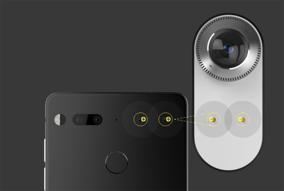 首先还是从Essential Phone来看,想要做生态,也逃不开设计这个话题。在Essential Phone的机身背面,靠近摄像头的地方有两个圆形的磁性触点,这两个触点是为外接设备准备的,而据外媒The Verge报道,这两个触点还可以用于无线数据传输。