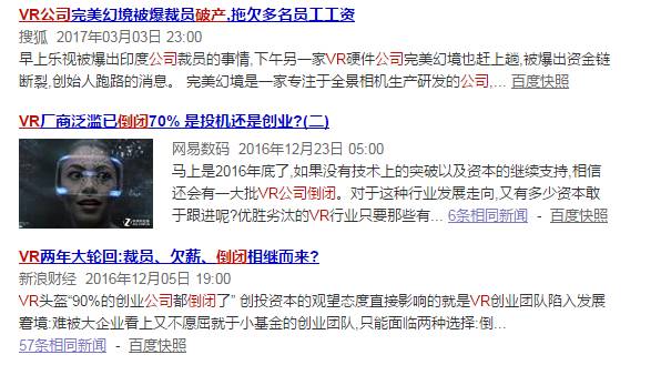 比Oculus Story Studio被关闭更早的,是国内VR行业的退烧。“去年九月开始,VR市场一下就降到了冰点。这个行业过去两年的发展中,很多资本关注的都是如何将更容易变现的硬件‘击鼓传花’,做内容的太少了。导致现在的现状是,硬件企业虽然多,但是却没有能拿得出手的硬件,软件内容也跟不上,无法支撑硬件的发展。新鲜劲儿一过,泡沫就破了。”一位在去年底离开VR行业的企业高管L告诉壹娱观察记者。