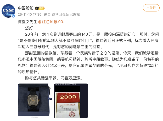 近日,“1999年小朋友捐款140元给国家造航母”一事引发关注。11月10日,@中国船舶 发文:陈虞文先生,26年前,您4次跑进邮局寄出的140元,是一颗投向深蓝的初心。福建舰近日正式入列,标志着人民海军迈入三航母时代。我们诚挚邀请您参观中国船舶集团,感受航母精神,聆听中船故事。随信为您准备了一份特殊的礼物:福建舰入列纪念手表,愿它记录强军梦圆的荣光,也见证您作为特殊“军迷”的炽热情怀。
