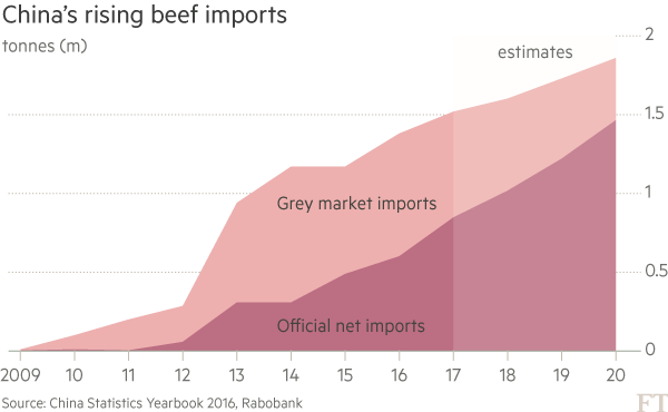 不过,尽管2003年美国爆发疯牛病后中国出台禁令禁止进口美国牛肉,但优质美国牛排早已出现在中国内地许多餐厅的菜单上:这是因为存在一个繁荣的、从香港二次进口的灰色市场,香港并不适用这项禁令。