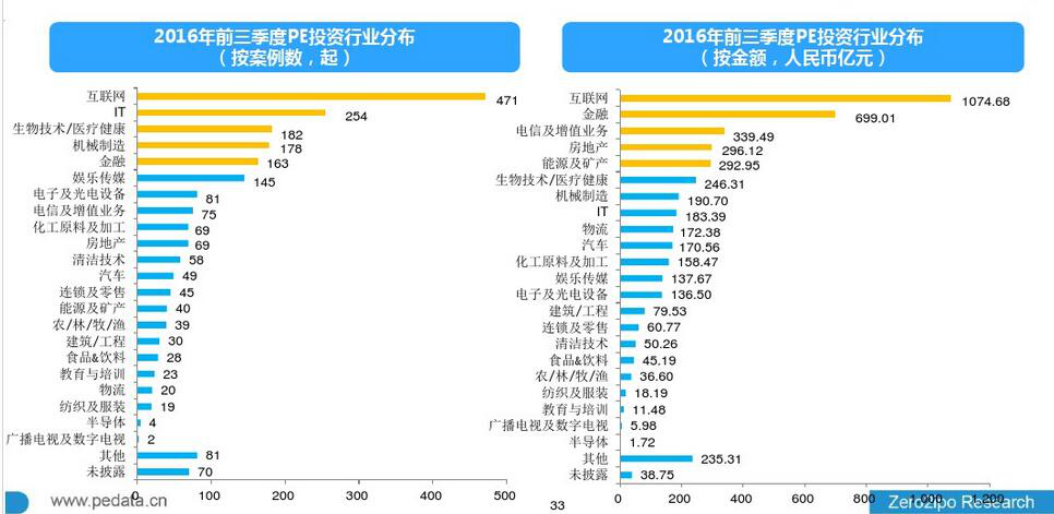在具体金额方面,2006-2016年前三季度中国股权投资市场募资情况(人民币VS外币)(天使/VC/PE)如下图所示,1216家人民币基金募集7545亿,50家外币基金募集752亿,股权投资最青睐的行业则是互联网、IT、生物技术、医疗健康、机械制造、金融。