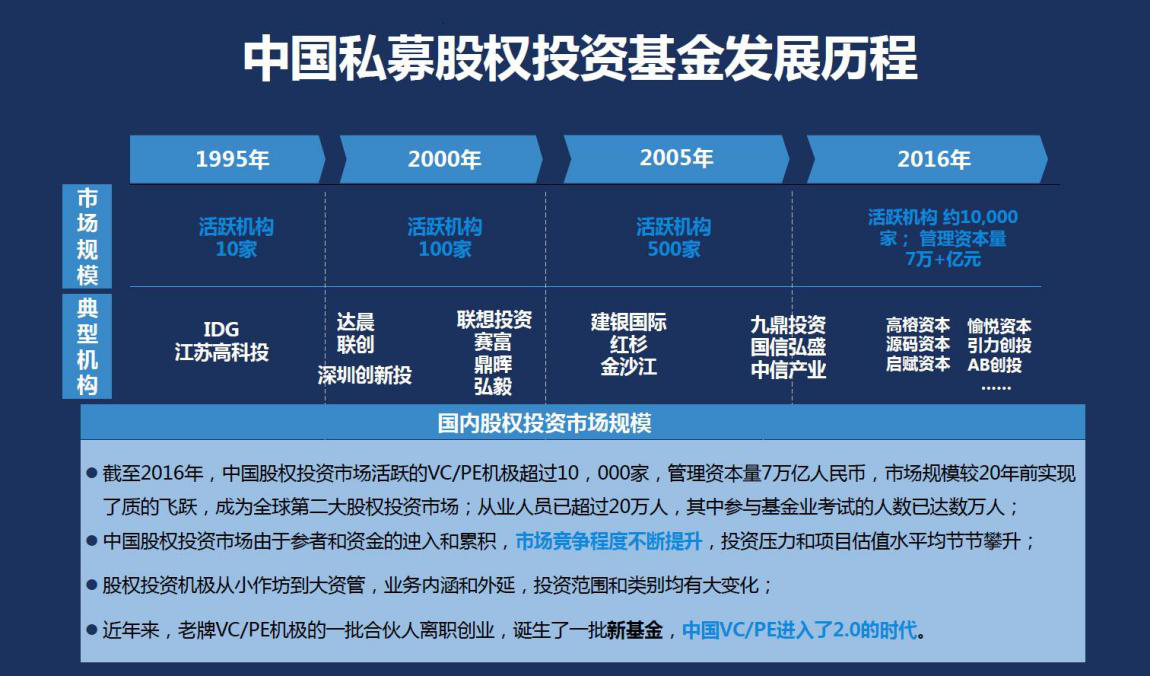 直到2004年,深圳中小企业板为私募股权投资提供了IPO的退出方式,私募股权投资成功的案例才开始出现。2004年到2014年十年时间,尽管金融危机使中国股权投资市场陷入低潮,但是《新合伙企业法》出台、创业板推出和新三板扩容等为股权投资发展提供了良好的政策环境。随着国内资本市场的日益成熟、行业监管政策落定和逐渐完善,中国市场逐步迈入股权投资新时代。