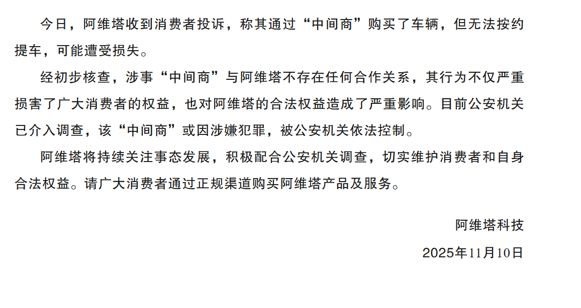 阿维塔科技11月10日发布声明:今日,阿维塔收到消费者投诉,称其通过“中间商”购买了车辆,但无法按约提车,可能遭受损失。经初步核查,涉事“中间商”与阿维塔不存在任何合作关系,其行为不仅严重损害了广大消费者的权益,也对阿维塔的合法权益造成了严重影响。目前公安机关已介入调查,该“中间商”或因涉嫌犯罪,被公安机关依法控制。阿维塔将持续关注事态发展,积极配合公安机关调查,切实维护消费者和自身合法权益。请广大消费者通过正规渠道购买阿维塔产品及服务。