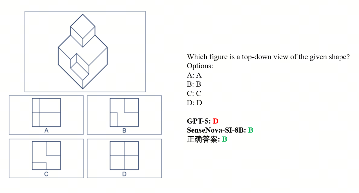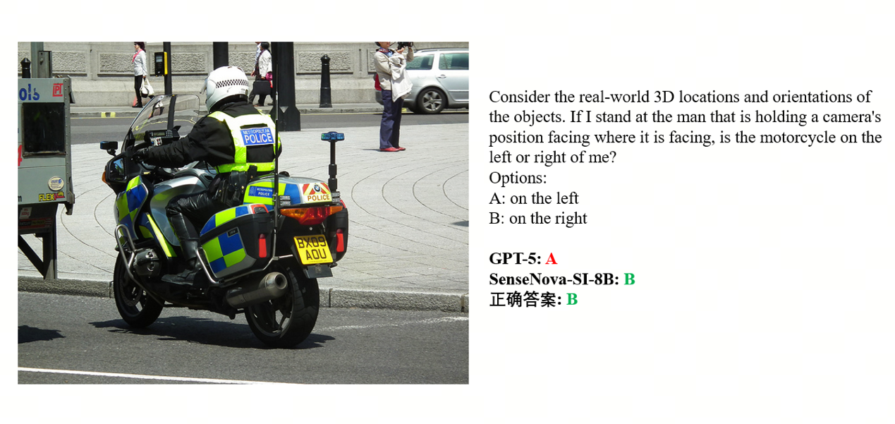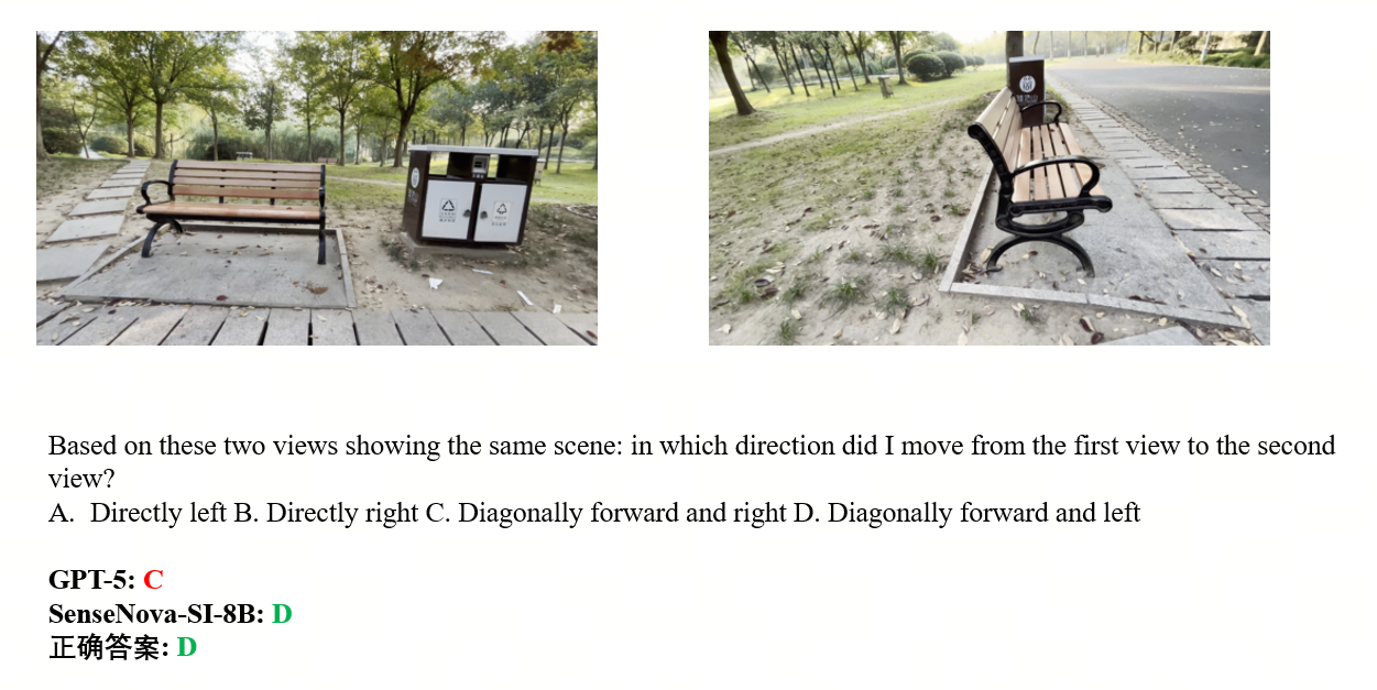 以下为GPT-5和SenseNova-SI-8B模型面对空间智能问题,给出的答案对比。