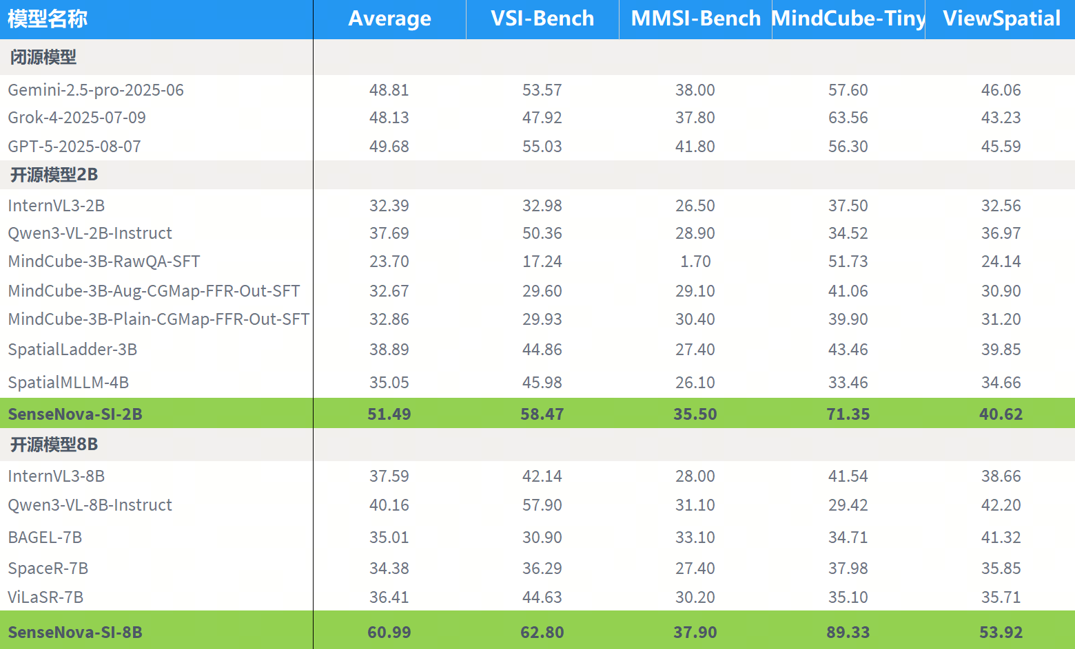最新评测数据显示,SenseNova-SI系列模型在空间智能多个基准测试(VSI、MMSI、MindCube、ViewSpatial)中表现突出,具体如下: