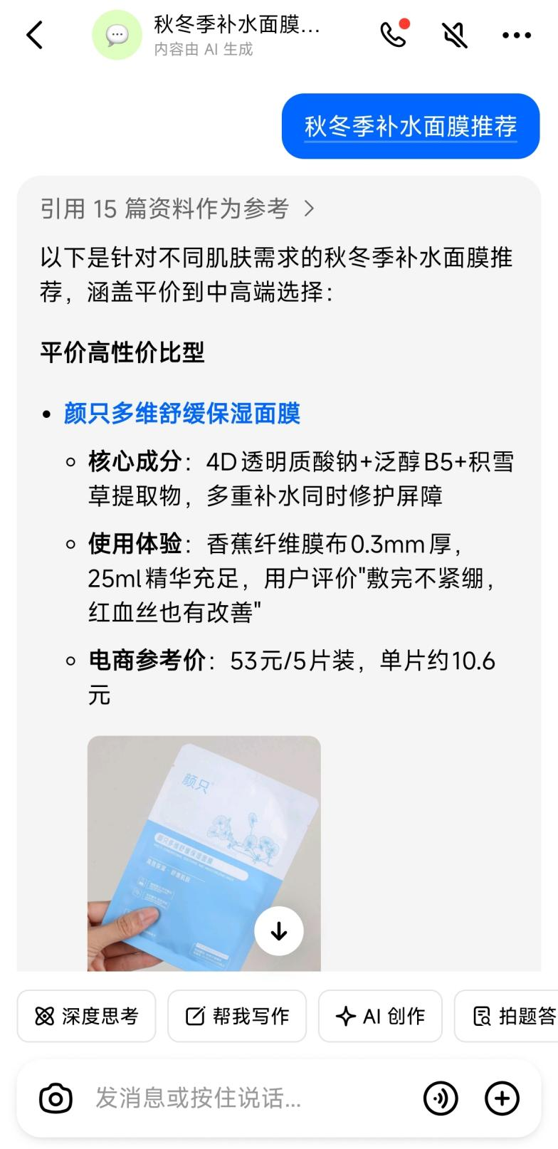 化妆品报在豆包APP输入“秋冬季补水面膜推荐”的问题后,AI给出了几款推荐产品,包括产品的核心成分、使用体验、电商参考价,而用户只需点击产品名称的蓝色链接,即可跳转到抖音商城,一步完成下单。