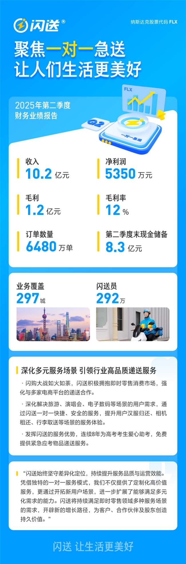 今年8月,闪送公司公布2025年第二季度财报,第二季度收入为10.2亿元,毛利率为12%,高于2024年同期的10.8%;归属普通股股东净利润5350万元,相较去年同期增幅达140%,同时,二季度完成订单6480万单。