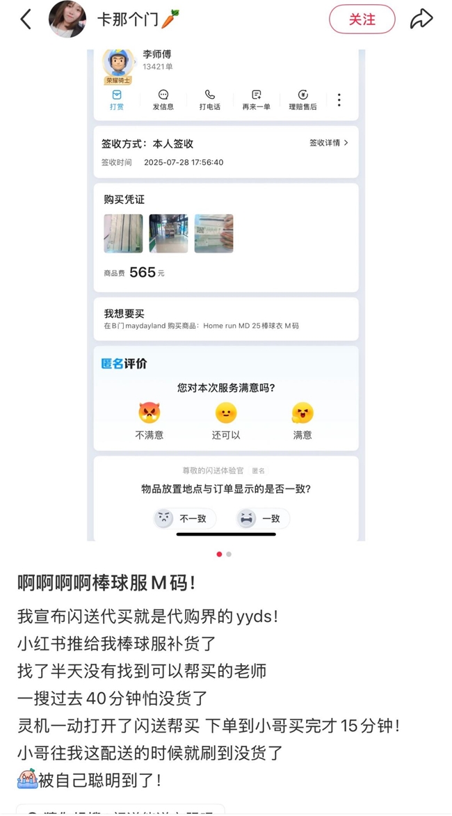 更有网友巧妙的利用闪送,抢购到了自己钟爱的衣物,既免去了向熟人开口的尴尬,又保障了“所见即所得”的快捷,大呼,“闪送代买是代购界的yyds!”