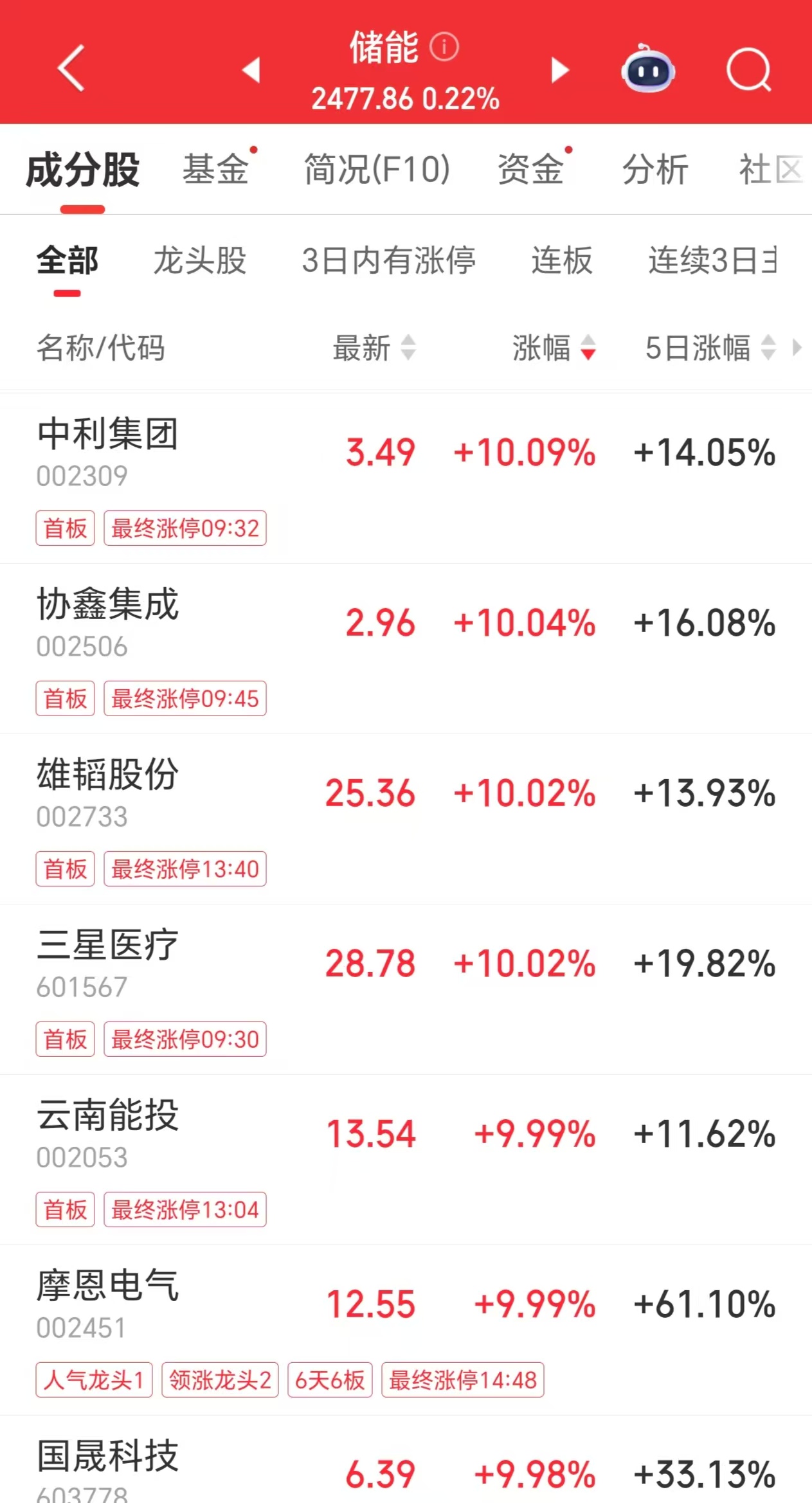 11月11日,储能板块走强。截至当日收盘,中利集团、协鑫集成、雄韬股份、三星医疗、云南能投等多股涨停。其中,国晟科技、新朋股份均“一字”涨停。