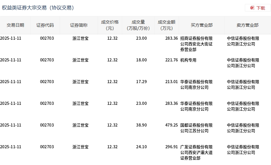 11月11日,浙江世宝大宗交易成交144.29万股,成交额1777.65万元,占当日总成交额的2.06%,成交价12.32元,较市场收盘价14.21元折价13.3%。