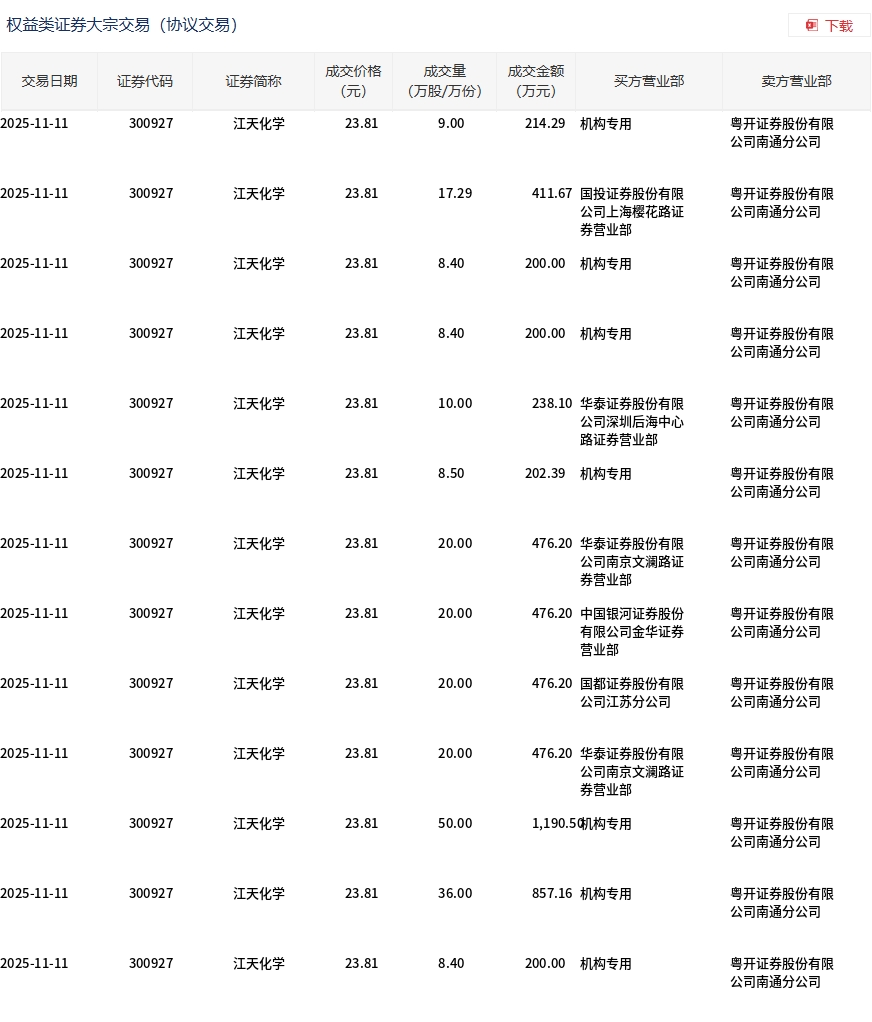 11月11日,江天化学大宗交易成交235.99万股,成交额5618.91万元,占当日总成交额的11.95%,成交价23.81元,较市场收盘价30.95元折价23.07%。
