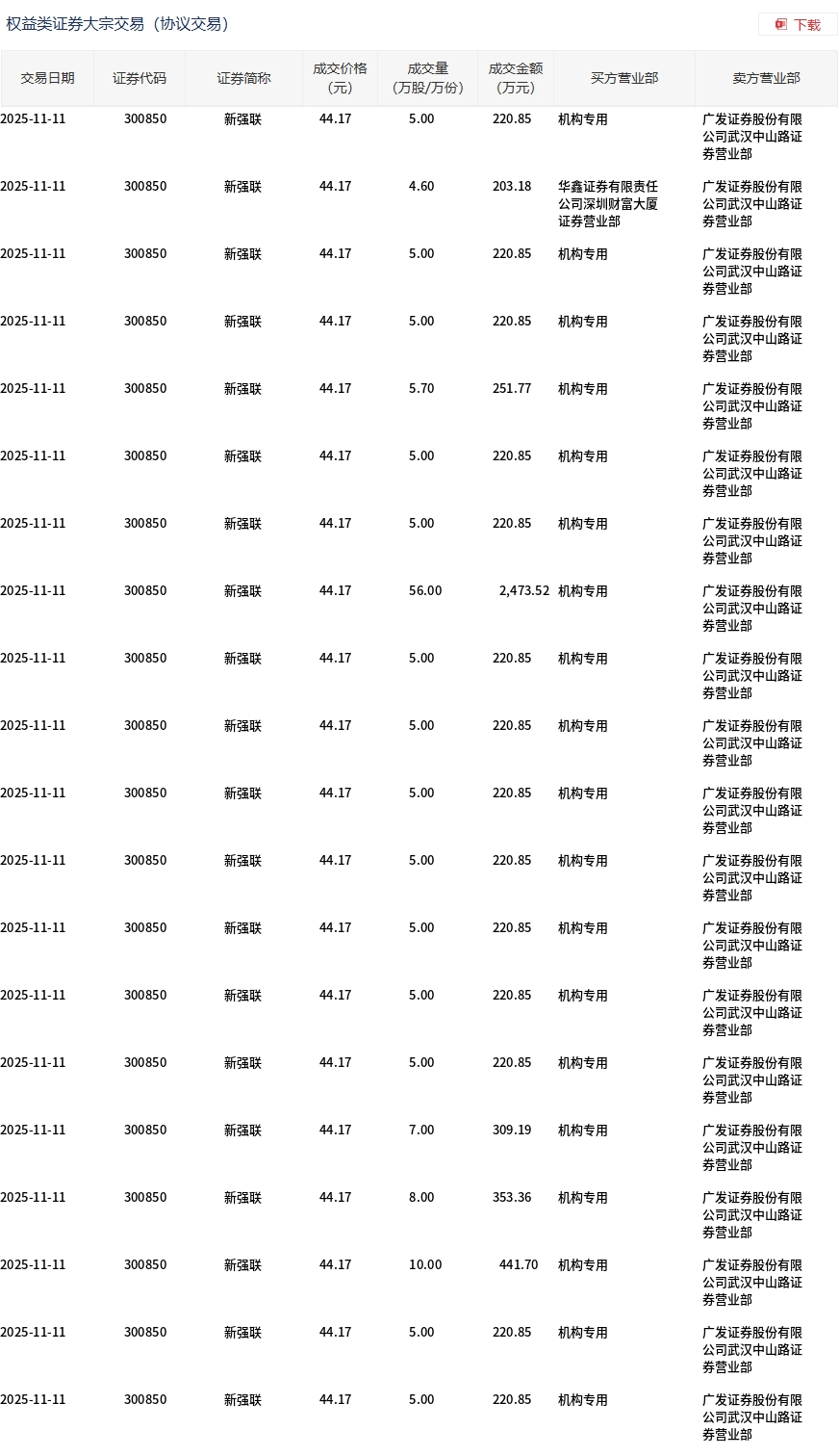 11月11日,新强联大宗交易成交277.1万股,成交额1.22亿元,占当日总成交额的14.23%,成交价44.17元,较市场收盘价47.78元折价7.56%。