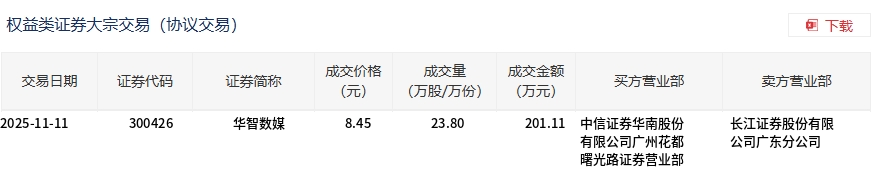 11月11日,华智数媒大宗交易成交23.8万股,成交额201.11万元,占当日总成交额的4.07%,成交价8.45元,较市场收盘价9.24元折价8.55%。