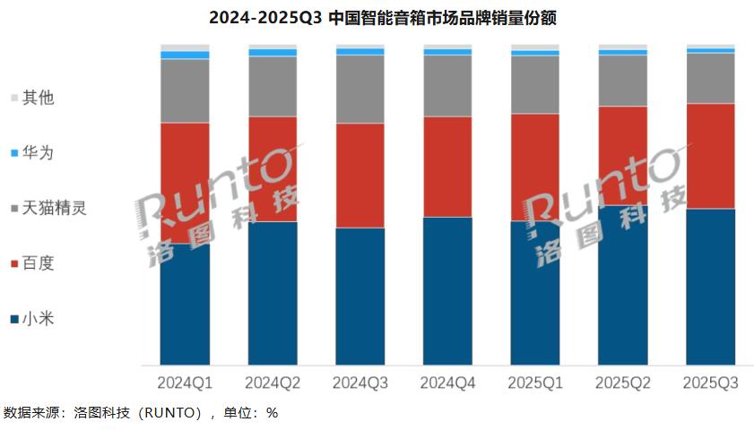 洛图科技在报告中指出,中国智能音箱市场是一个极高的寡占型市场,长期以来,百度、小米、天猫精灵这TOP3品牌的合计销量份额维持在90%以上。在2025年第三季度,占有率再次增长至97%以上。