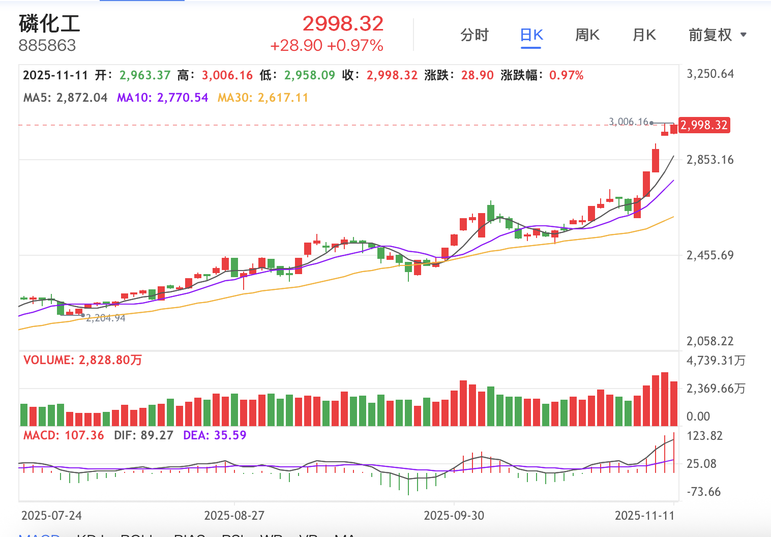 从细分领域看,磷化工(885863)指数涨幅尤为显著,自11月5日起连续五个交易日上涨,11月11日收涨0.97%。同花顺显示,该板块内,近七成个股上涨。清水源(300437.SZ)、宏源药业(301246.SZ)、天际股份(002759.SZ)等涨幅超5%。
