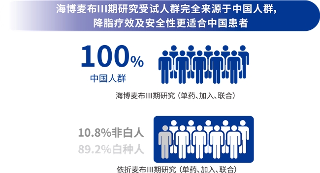 海博麦布的 III 期临床研究(涵盖单药、加入、联合等用药方式),受试人群 100% 来源于中国人群[4](而依折麦布 III 期研究中仅 10.8% 为非白种人,89.2% 为白种人[6,7,8])。这意味着海博麦布的疗效及安全性数据是在中国患者的实际临床场景中获取的,能够更精准地反映中国血脂异常患者使用该药物的真实情况,为临床医生制定治疗方案提供了更具针对性的依据。