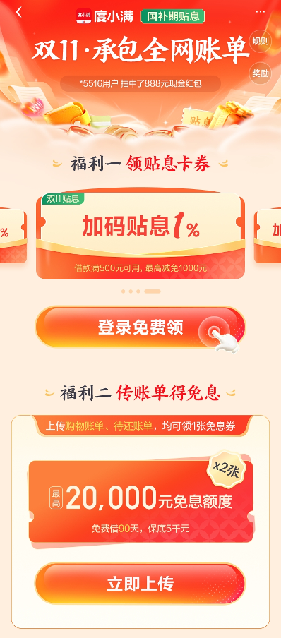11月以来,度小满的“国补贴息”活动还在继续,面向特邀用户推出专项福利,主要包括“领贴息券”与“传账单得免息”两项举措。用户如果在9月、10月已领取贴息券并参与了相应的活动,11月的活动还可以继续参与,一年累计最高可节省1500元利息成本。