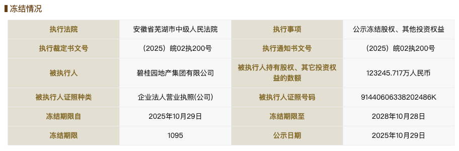 国家企业信用信息公示系统网站显示,10月29日,碧桂园地产集团有限公司新增一则股权冻结信息,股权所在企业为佛山源康房地产发展有限公司,冻结股权数额12.3亿余元,冻结期限为三年,执行法院为安徽省芜湖市中级人民法院。