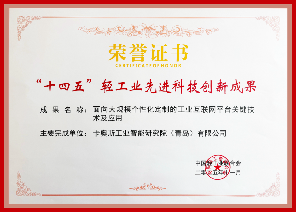 “十四五”期间,针对工业互联网跨企业、跨网络、跨系统集成与协同难以及工业知识、数据开放性差等难题,卡奥斯智研院牵头“面向大规模个性化定制的工业互联网平台关键技术及应用”项目,突破了全流程端到端数据集成与融合技术等关键技术,并搭建卡奥斯COSMOPlat工业互联网平台,在制造业开展大规模应用推广。项目成果通过了中国轻工业联合会、中国人工智能学会、中国电子学会组织的科技成果鉴定,多项技术达到国际领先水平,获得山东省科技进步特等奖。