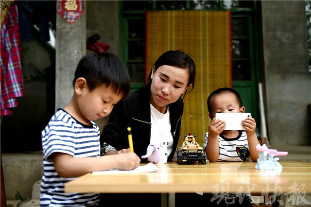 下班回了家,袁萃红就赶紧忙活晚饭,有时间的话也会搬出一张小方桌,辅导大儿子的功课,小儿子则乖乖坐在妈妈身旁玩耍。