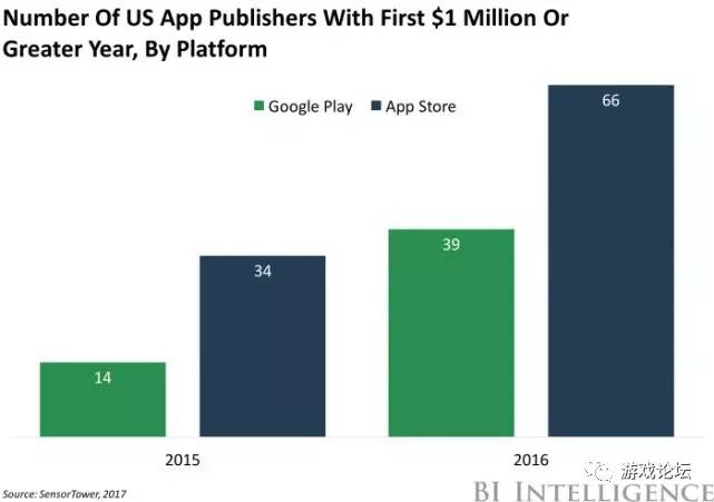 2016年,美国共有66家iOS出版商的应用收入达到或超过100万美元,大约是同期在Google Play上取得同样收入成绩的出版商数量的1.7倍,大约是2015年应用收入达到或超过100万美元的iOS出版商数量的2倍。
