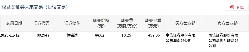 11月12日,恒铭达大宗交易成交10.25万股,成交额457.36万元,占当日总成交额的1.56%,成交价44.62元,较市场收盘价47.48元折价6.02%。