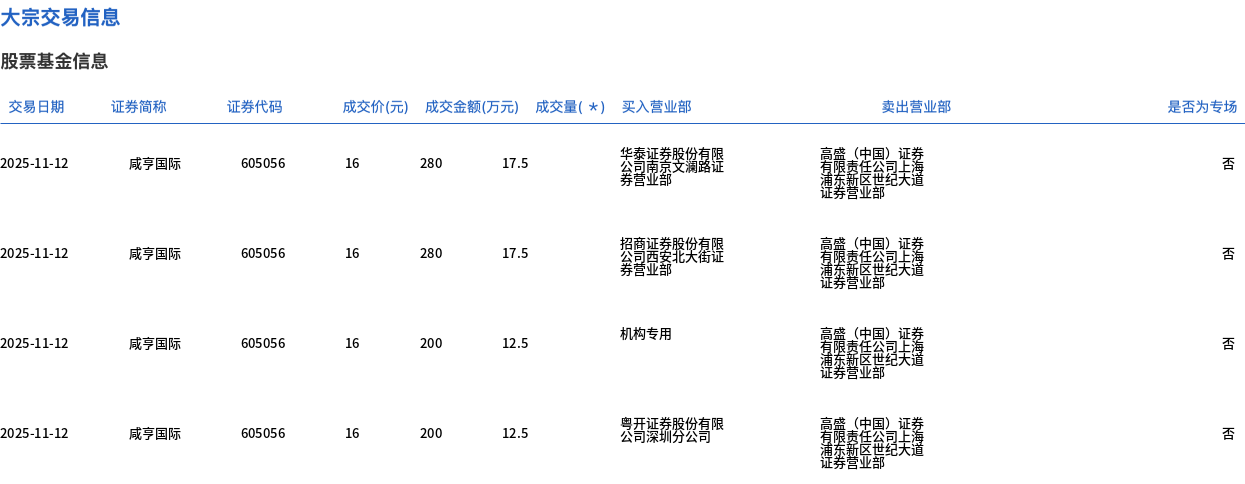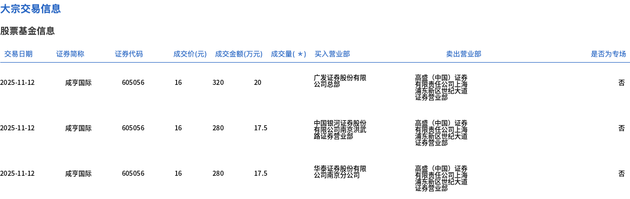 11月12日,咸亨国际大宗交易成交115万股,成交额1840万元,占当日总成交额的7.86%,成交价16元,较市场收盘价18.46元折价13.33%。