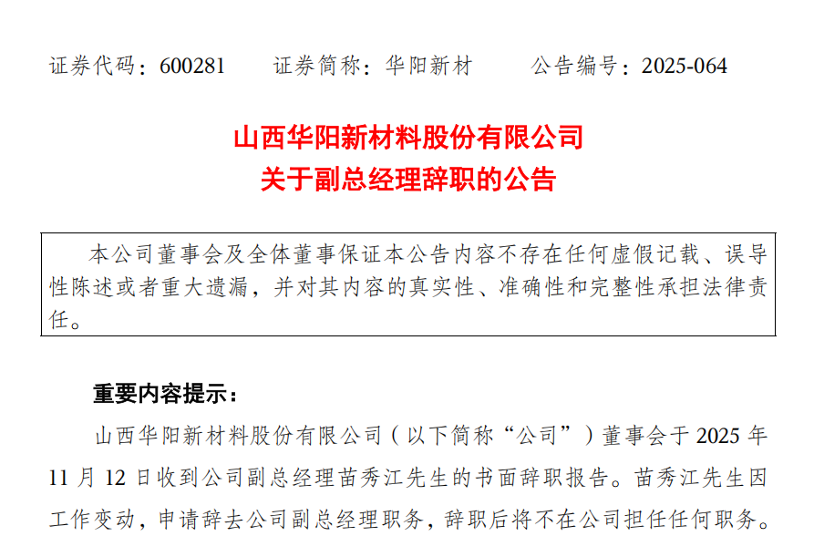 据上交所官网消息,11月12日晚间,山西华阳新材料股份有限公司(股票简称:华阳新材;股票代码:600281)副总经理苗秀江因工作变动向董事会提交书面辞职报告,申请辞去华阳新材副总经理职务,辞职后将不在公司担任任何职务。