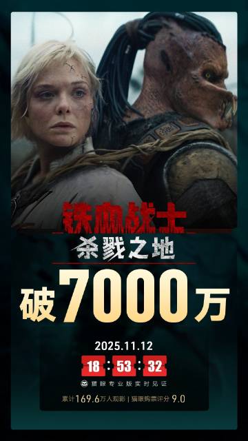 据猫眼专业版数据,电影《铁血战士:杀戮之地》上映6天,总票房破7000万。