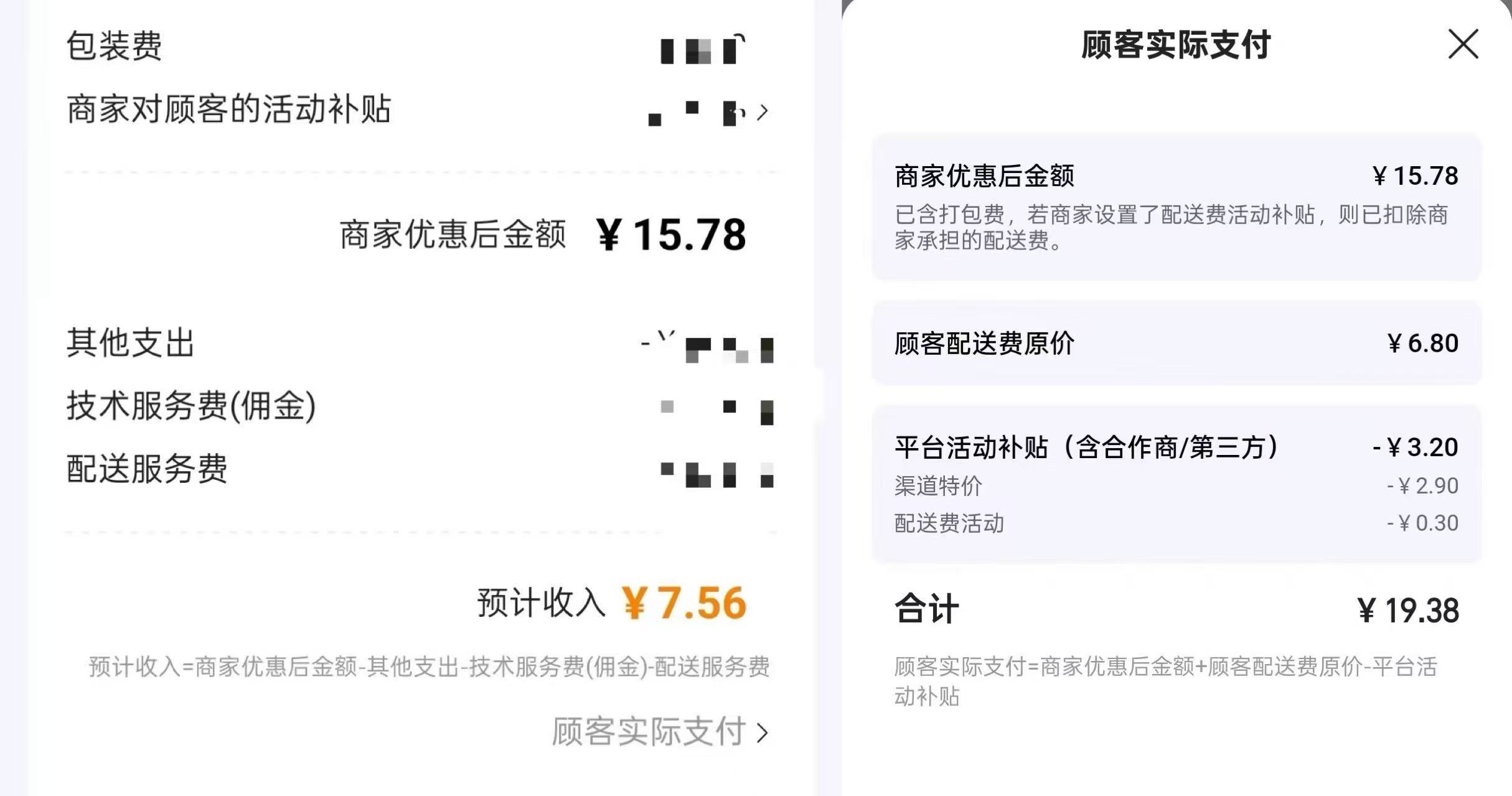 前几天有个顾客问他,为什么点了两份青菜,只有8片菜叶。他看了订单后解释:这位顾客点了9种菜品,加上打包盒、炸淀粉肠,他后台到手7.5,这个价格不可能买到更多的青菜了。“很多人在点外卖的时候不会计算房租、水电、配送和平台抽点,但我们必须算进去,只能做到尽量便宜。”