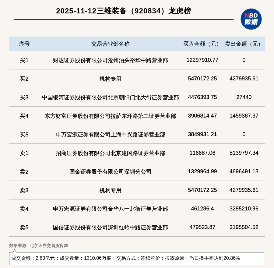 据每日经济新闻消息,2025年11月12日,北交所上市公司三维装备(920834,收盘价:19.35元)登上龙虎榜,交易方式是连续竞价,披露原因是当日换手率达到20.86%,成交数量1310.06万股,成交金额2.63亿元。买一席位为财达证券股份有限公司沧州泊头裕华中路营业部,买入1229.79万元;卖一席位为招商证券股份有限公司北京建国路证券营业部,卖出513.98万元。