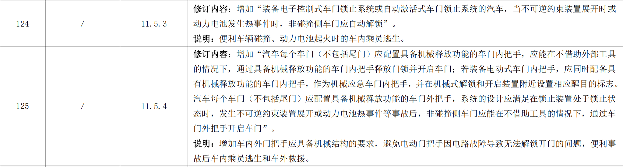 对于门把手,“征求意见稿”也新增了更详细的要求。增加“汽车每个车门(不包括尾门)应配置具备机械释放功能的车门内把手,应能在不借助外部工具的情况下,通过具备机械释放功能的车门内把手释放门锁并开启车门;若装备电动式车门内把手,应同时配备具有机械释放功能的车门内把手,作为机械应急车门内把手,并在机械式解锁和开启装置附近设置相应醒目的标志。汽车每个车门(不包括尾门)应配置具备机械释放功能的车门外把手,系统的设计应满足在锁止装置处于锁止状态时,发生不可逆约束装置展开或动力电池热事件等事故后,非碰撞侧车门应能在不借助工具的情况下,通过车门外把手开启车门”。