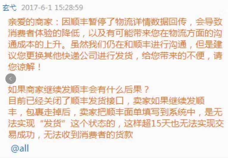 他告诉界面新闻记者,今年三月“顺丰配”已上线,但顺丰对菜鸟有定额限制,只在小范围定额,不是所有商家都能使用“顺丰配”,经过这次数据接口风波,他预计“顺丰配”很快要下线。