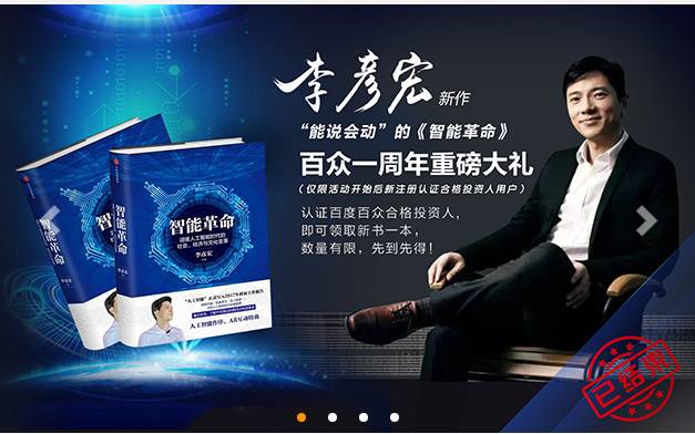 同样,官网最近未上新项目,最近一期项目结束于今年3月。网站的新闻公告及其官方微信【百众股权投融资】仍保持着更新。今年4月,为吸引新的投资人注册认证,还推出“认证投资人送李彦宏新书一本”的活动。看来百度百众暂时还不会像其“兄弟平台”百度众筹一样迎来被默默下线的命运。