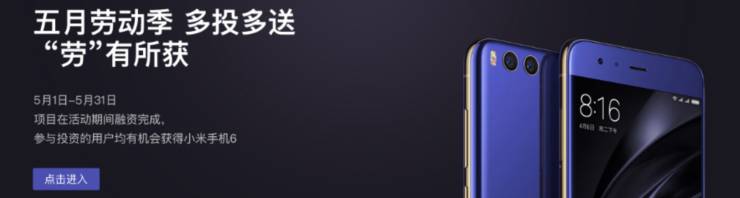 本月米筹还在官网首页举办了名为“五月劳动季”鼓励投资,活动结束将在5月投资人里抽取3名投资人获得小米6。