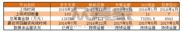 众筹家统计了京东东家、蚂蚁达客、米筹金服、360淘金和百度百众5家平台目前的运营状况,制出了一张能较直观反应这5家股权众筹平台现状的表格。