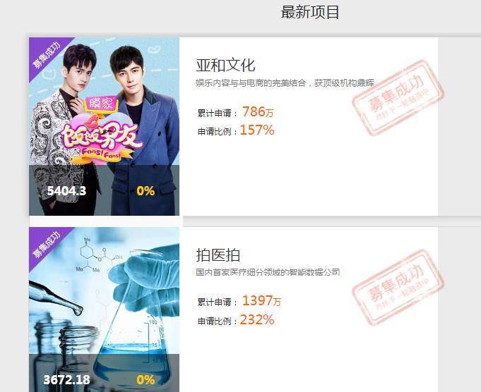 目前最新一个项目在今年5月融资完成,另有一项目处于预热中,暂无项目处于众筹中。