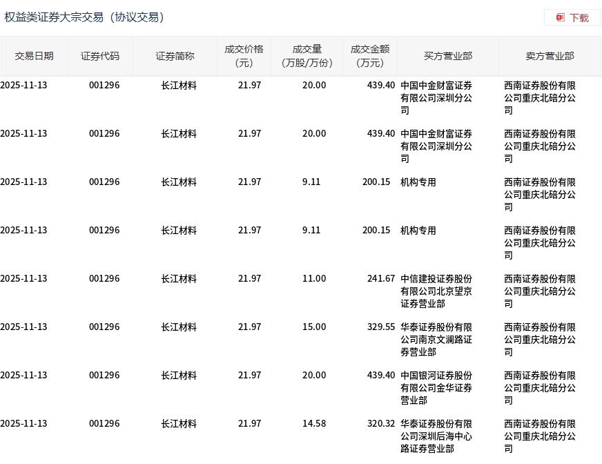 11月13日,长江材料大宗交易成交118.8万股,成交额2610.04万元,占当日总成交额的13.41%,成交价21.97元,较市场收盘价24.41元折价10%。