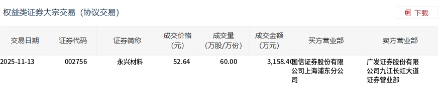 11月13日,永兴材料大宗交易成交60万股,成交额3158.4万元,占当日总成交额的1.74%,成交价52.64元,较市场收盘价53.99元折价2.5%。