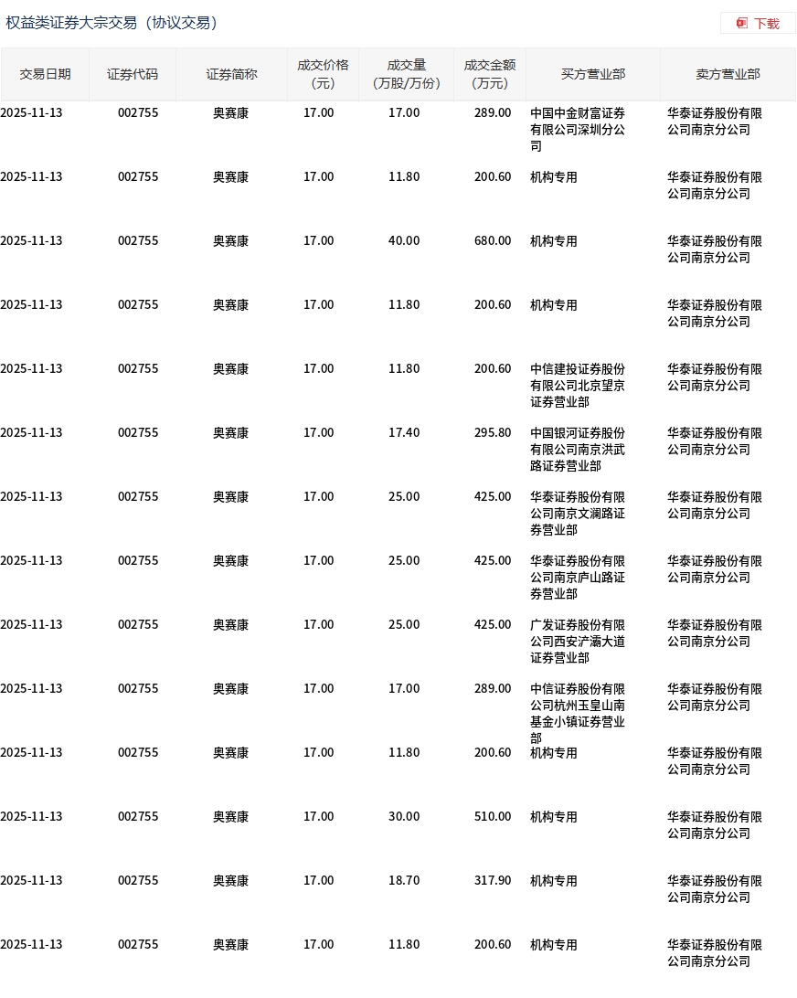 11月13日,奥赛康大宗交易成交274.1万股,成交额4659.7万元,占当日总成交额的8.71%,成交价17元,较市场收盘价19.39元折价12.33%。