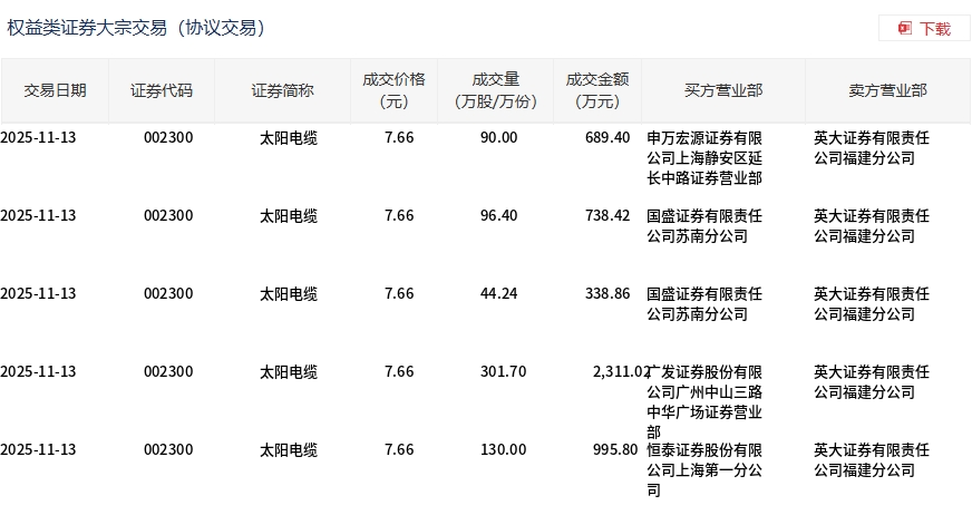 11月13日,太阳电缆大宗交易成交662.34万股,成交额5073.5万元,占当日总成交额的4.46%,成交价7.66元,较市场收盘价8.32元折价7.93%。